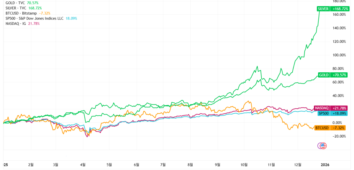 28일 트레이딩뷰에 따르면 비트코인은 올해 들어 전일까지 7% 남짓 하락했다. 비트코인은 발행자 리스크가 없고 제재 회피 수단으로 활용되면서 금과 자주 비교 대상에 올랐다. 다만, 올해 시장 흐름은 통념과 정반대였다. 안전자산인 금과 위험자산인 주식이 동시에 상승세를 보이며 사상 최고치를 경신했지만, 비트코인은 뚜렷한 상승 동력을 확보하지 못한 채 제자리걸음을 이어갔다.