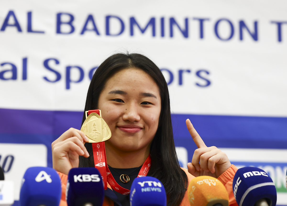 BWF가 도입을 논의 중인 ‘15점 3세트제’가 안세영에게 어떤 영향을 끼칠지 주목된다. 안세영이 지난 22일 BWF 월드 투어 파이널 대회를 마치고 인천국제공항을 통해 귀국한 뒤 메달을 들어보이고 있다. 뉴시스 |