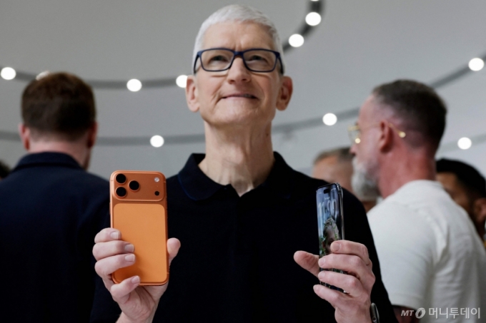 팀 쿡 애플 CEO가 미국 캘리포니아주 쿠퍼티노 애플 파크 에서 아이폰17 시리즈를 공개하고 있다./AFP=뉴스1 |