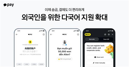 ▲ 카카오페이[377300]가 송금과 결제 서비스로까지 다국어 지원 범위를 확대했다고 29일 밝혔다. 송금 서비스는 첫 화면, 오픈채팅 송금, 계좌 송금, 친구 송금, QR 송금 등 주요 송금 기능을 다국어로 지원한다. 결제 서비스는 결제창 내 카드 등록 화면에 다국어 지원을 적용한다. 지원 언어는 영어, 중국어, 베트남어, 한국어 등 4개 국어다.