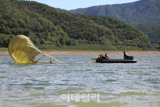 지난 9월 23일 한미 특전사 장병들이 대구 군위호에서 한미연합 수상강하 후, 보트를 활용해 강하자를 구조하고 낙하산을 회수하고 있다. (사진=합참) |