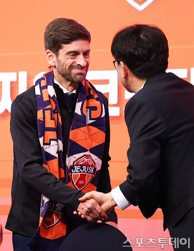 [스포츠투데이 팽현준 기자] 세르지우 코스타 감독이 29일 서울 강서구 메이필드호텔에서 열린 제주 SK FC 감독 부임 기자회견에서 제주FC 스카프를 걸고 있다. 2025.12.29.