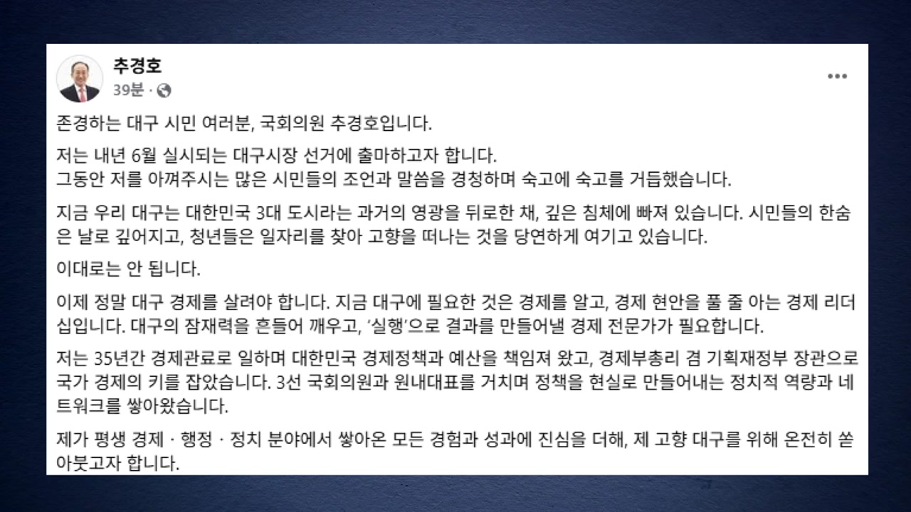 추 의원은 오늘(29일) 출마 선언문을 통해, 평생 경제·행정·정치 분야에서 쌓은 모든 경험과 성과를 이제는 고향 대구에 온전히 쏟아붓고자 한다며 이같이 밝혔습니다.