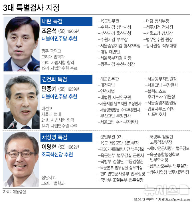 [서울=뉴시스] 이재명 대통령은 12일 '3대 특검(내란·김건희·채상병특검법)'에 따른 특별검사로 조은석 전 감사원장 권한대행과 민중기 전 서울중앙지방법원장, 이명현 전 국방부 검찰단 고등검찰부장을 지명했다. 민주당이 추천한 조 권한대행이 내란 특검, 민 전 법원장이 김건희 특검에 각각 지명됐고, 채상병 특검에는 조국혁신당이 추천한 이 전 부장이 지명됐다.(그래픽=전진우 기자) 618tue@newsis.com |
