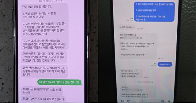 지난해 8월 22일 김 원내대표 장남인 김모씨(왼쪽 사진)가 김 원내대표의 전 보좌진 A씨에게 귀빈 방문에 대한 사실 관계 확인을 부탁했다. 부탁을 받은 A씨(오른쪽 사진)는 관련 기업인 한화 측에 관련 문의를 넣었다. 제보자 제공 |