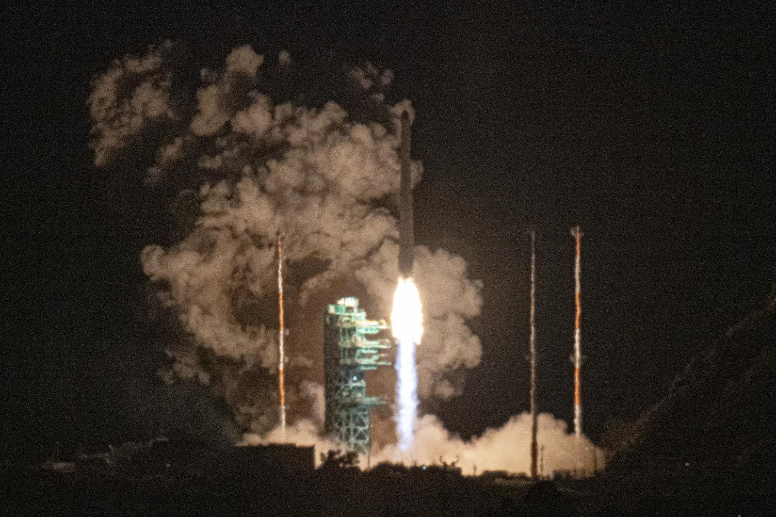 한국형 발사체 누리호 4호기가 27일 새벽 전남 고흥군 나로우주센터에서 발사되고 있다. 민간 기업인 한화에어로스페이스가 기술 이전을 통해 발사체 제작 과정을 주관한 누리호 4호기는 오로라·대기광 관측과 우주 자기장·플라스마 측정 등을 위한 위성 13기가 탑재됐다. 여수=박형기 기자 onehsot@donga.com |