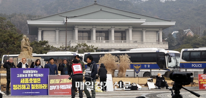 민주노총 공공운수노조 서울지역공공서비스지부 청와대분회가 29일 오전 청와대 사랑채 앞에서 집회를 이어가고 있다. [이수민 기자] |