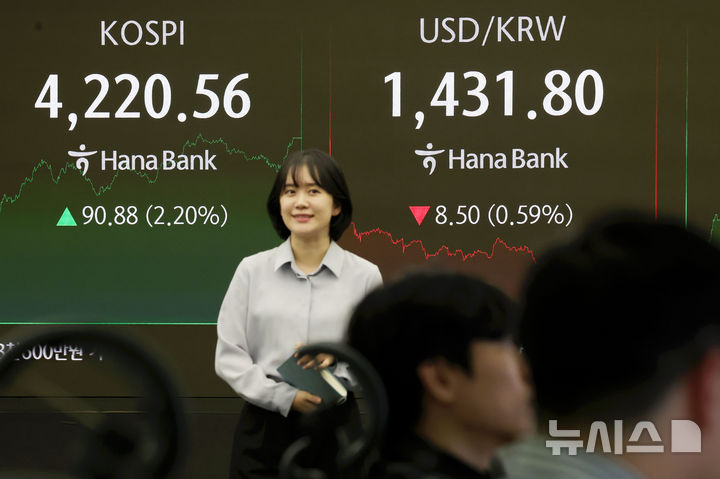 [서울=뉴시스] 홍효식 기자 = 코스피가 전 거래일(4129.68)보다 90.88포인트(2.20%) 오른 4220.56에 마감한 29일 오후 서울 중구 하나은행 딜링룸 전광판에 지수가 표시되고 있다.