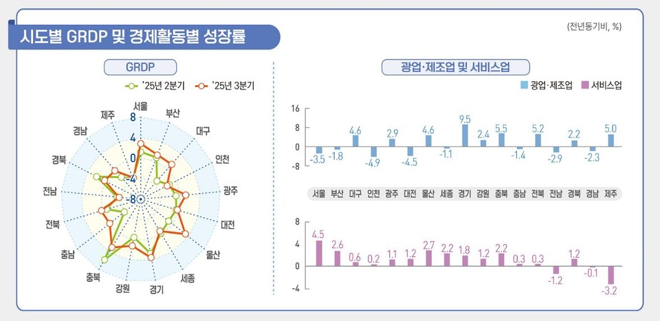 시도별 2025년 3분기 실질 지역내총생산(GRDP) 및 경제활동별 성장률. |