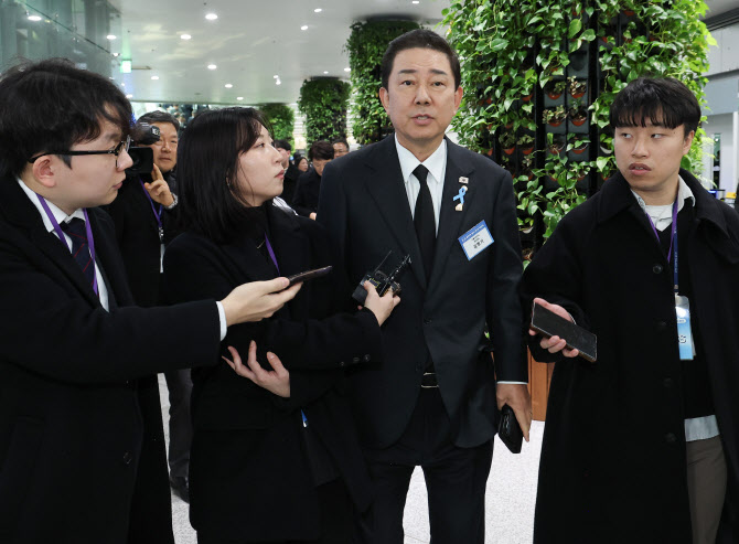 더불어민주당 김병기 원내대표가 29일 전라남도 무안군 무안국제공항 여객터미널에서 열린 12ㆍ29 여객기 참사 1주기 추모식을 마친 뒤 취재진의 질문에 답하고 있다. (사진 = 연합뉴스) |
