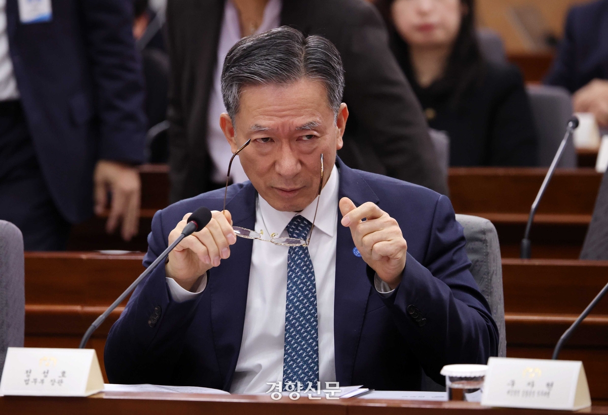 정성호 법무부 장관이 지난 19일 정부서울청사 별관에서 열린 법무부(대검찰청), 성평등가족부 업무보고가 시작되기 전 자리에서 안경을 고쳐쓰고 있다. 대통령실사진기자단 |