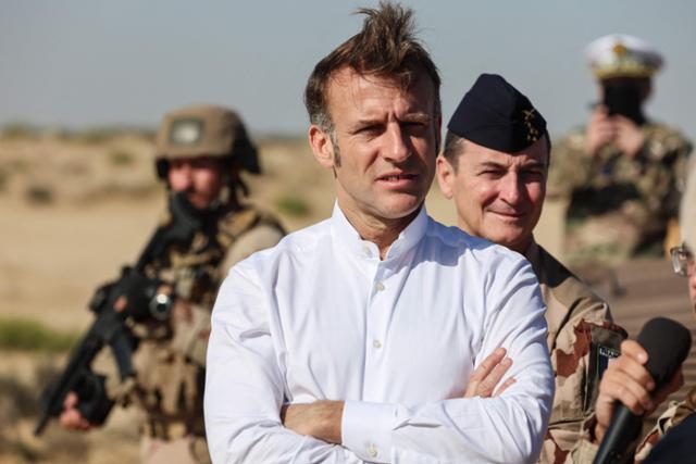 에마뉘엘 마크롱 프랑스 대통령이 22일 아랍에미리트(UAE) 방문 당시, 군사도시 자예드 인근에 위치한 제5 기갑연대 기지를 찾아 프랑스 군부대 기동 훈련을 지켜보고 있다. AFP 연합뉴스 |