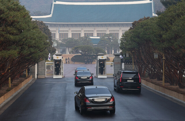 이재명 대통령 차량 행렬이 29일 서울 종로구 청와대 정문으로 들어가고 있다. 이 대통령이 이날 청와대로 첫 출근을 하면서, 3년7개월간의 ‘용산 시대’가 막을 내리고 다시 ‘청와대 시대’가 열렸다. 청와대사진기자단 |