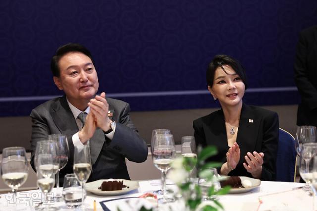 윤석열(왼쪽) 전 대통령과 김건희 여사가 2022년 6월 29일 마드리드 시내 호텔에서 열린 재스페인 동포 초청 만찬간담회에서 박수를 치고 있다. 마드리드=서재훈 기자 |