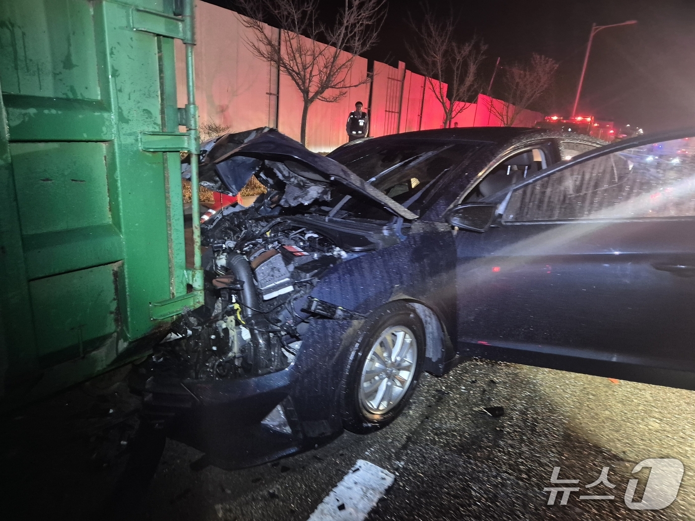 (당진=뉴스1) 최형욱 기자 = 29일 오후 7시 30분께 충남 당진 석문면 삼봉공원 인근 도로에서 주행 중이던 승용차 한 대가 길가에 있던 암롤박스(쓰레기 적재함)를 들이받았다.