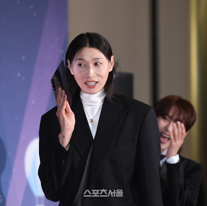 김연경이 29일 서울 상암동 MBC 미디어센터에서 열린 2025 MBC 방송연예대상 포토월에서 장난을 치고 있다.