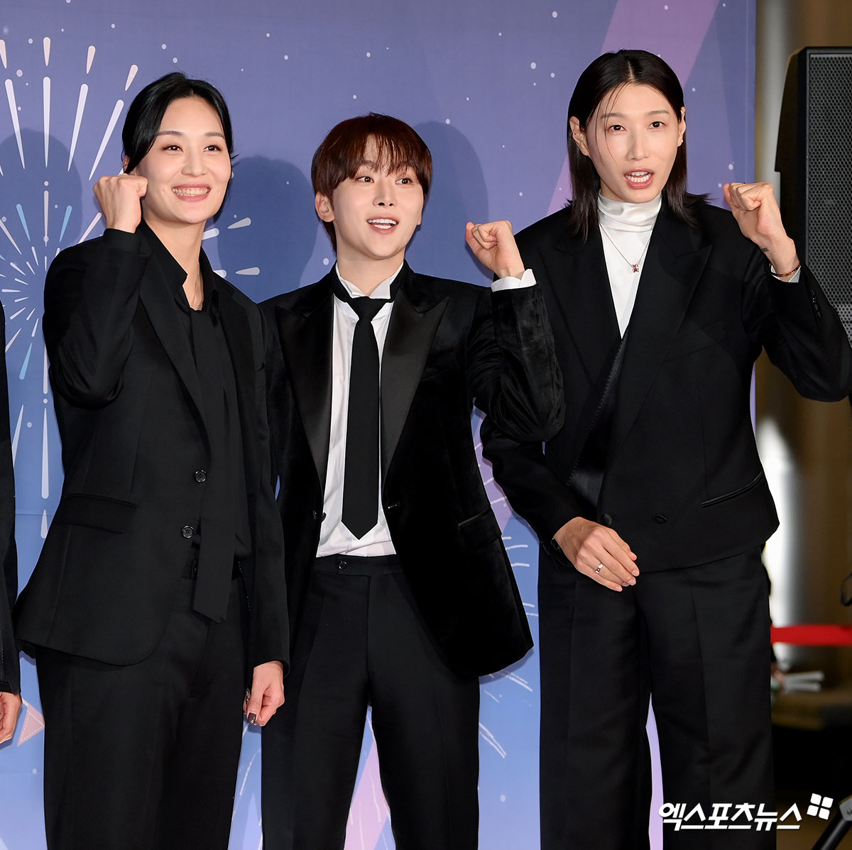 '신인감독 김연경' 표승주, 세븐틴 승관, 김연경이 포토타임을 갖고 있다.