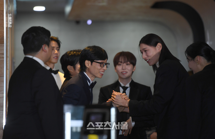 유재석이 29일 서울 상암동 MBC 미디어센터에서 열린 2025 MBC 방송연예대상 포토월 행사에서 앞팀 김연경과 인사를 하고 있다.