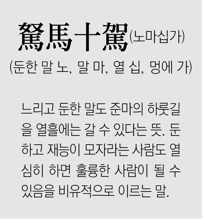 ● 유래: 순자(荀子) 수신편(修身篇)에서 유래한 성어입니다. 중국 전국시대 말기의 사상가 순자는 ‘인간의 본성은 악하다’는 성악설(性惡說)에 기초해 타고난 기질을 극복하고 도덕적인 인격체로 완성되기 위해서는 후천적인 학습과 수양이 필수적임을 강조했습니다. ‘노마십가’는 순자가 교육 철학으로 성실함을 강조하는 것을 가장 잘 보여주는 구절입니다. 순자는 타고난 재능보다 인위적인 노력이 성취를 결정하는 근본임을 역설하며 말하기를 “천리마가 한 번 껑충 뛰어넘는다고 열 걸음을 가지는 못하며(騏驥一躍, 不能十步), 둔한 말이라도 열 번 수레를 끌면 천리마가 하루에 달린 거리에 미칠 수 있다(駑馬十駕, 則亦及之矣)”라고 했습니다. ‘공은 포기하지 않는 데 있다(功在不舍)’고 말하며 성공은 다른 데 있는 것이 아니라 꾸준히 노력하는 데 있다는 것을 강조했습니다. 다만 무턱대고 무리하는 것을 경계하고 지혜로운 노력을 강조했습니다.