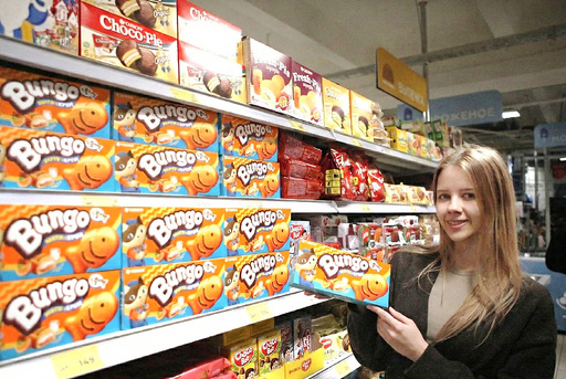 오리온은 러시아 법인에 ‘참붕어빵’ 생산 라인을 구축하고 현지 시장에 출시했다고 29일 밝혔다. 내년 초에는 대형 슈퍼마켓 체인인 ‘삐쪼르치카’ 약 1만5000개 매장에도 제품을 공급한다. 사진은 모델이 참붕어빵 제품을 소개하는 모습.