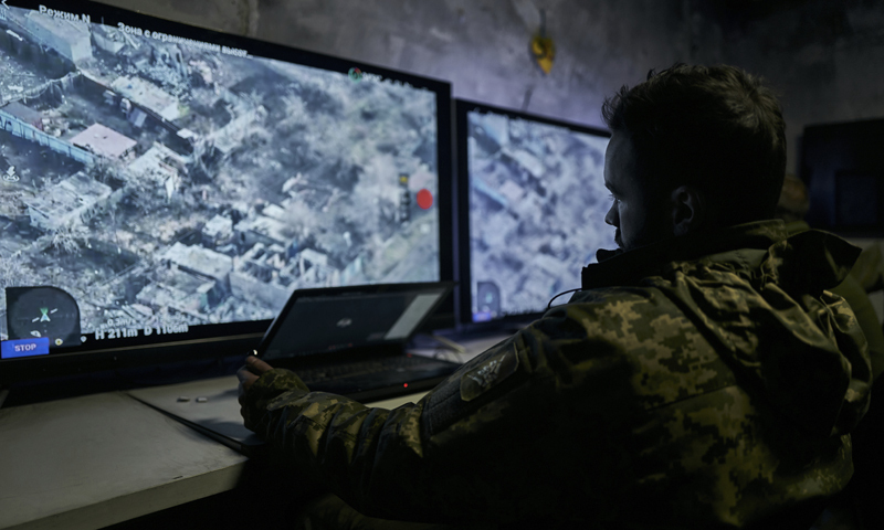 우크라이나의 한 병사가 드론이 보내오는 영상을 지켜보고 있다. AP연합뉴스 |