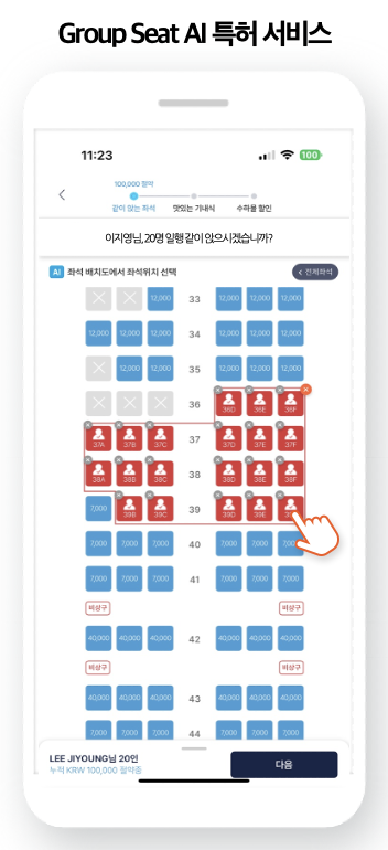 또한 개별 고객(1인~9인)을 넘어 모두투어/하나투어 등 패키지 단체 고객 대상 AI 좌석추천 서비스를 적용 중인데, 20명 단체 고객이 단 한 번의 터치만으로 일행이 흩어지지 않고 함께 앉는 좌석 선택이 가능해져 매우 혁신적이다.