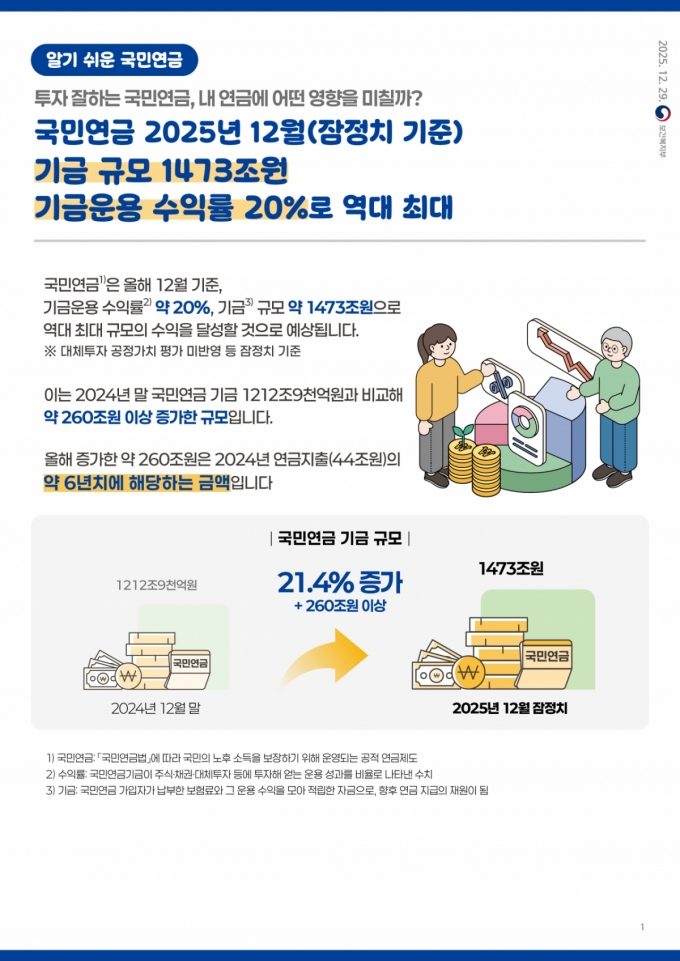 수익률 급등에 올해 기금규모는 1473조원으로 지난해 말보다 약 260조원(21.4%) 증가했다. 지난해 연금급여 지출(44조원)의 약 6배가 1년 새 늘어난 것이다. 2020년(721조원) 기금과 견주면 6년 만에 2배로 불었다.