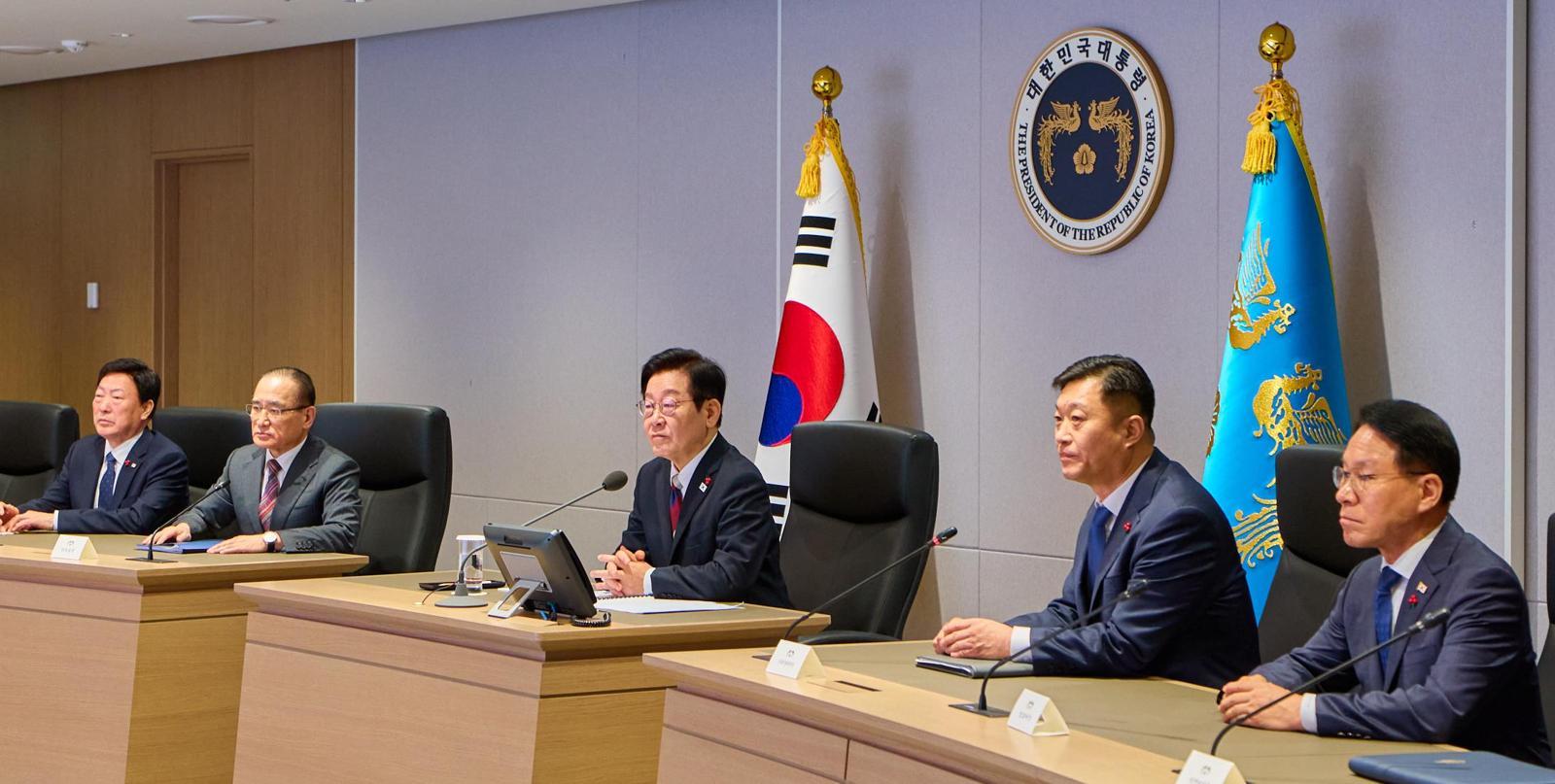 이재명 대통령은 29일 서울 종로구 청와대로 첫 출근을 한 직후 참모들과 가진 아침 차담회의에서 “2025년 수출과 외국인 투자가 역대 최대 실적을 달성할 것”이라는 하준경 대통령경제성장수석비서관의 보고를 받고 이렇게 말했다. 수석들의 업무 보고를 받고 지시하는 과정에서 통상 45분간 진행됐던 차담회의는 이날 1시간 20분가량으로 길어졌다고 한다. 이 대통령은 이날 취임식 때 착용했던 ‘통합 넥타이’를 매고 청와대로 출근했다.