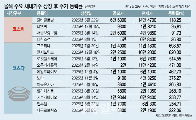 티엠씨(217590) 역시 상장 이후 96% 상승하며 견조한 주가 흐름을 이어갔다. 올해 3월 상장한 서울보증보험(031210)의 경우 12월 현재까지 공모가 대비 92% 가까이 올랐다. 상대적으로 변동성이 큰 중소형주 중심의 IPO 시장에서, 코스피 상장 종목들이 안정적인 성과를 냈다는 점은 올해 시장의 또 다른 특징으로 꼽힌다.