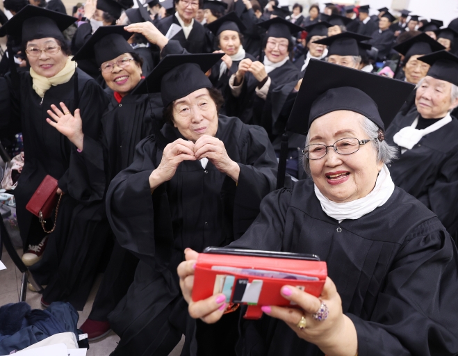 노인대학 학사모 쓴 어르신들 - 29일 경기 안양시 동안노인복지회관에서 열린 ‘노인대학 제29기 졸업식’에서 학사모를 쓴 어르신들이 기념사진을 찍으며 환하게 웃고 있다. 연합뉴스 |