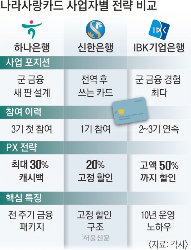 군 병력 감소 흐름 속에서도 나라사랑카드를 둘러싼 은행권 물밑 전투는 오히려 격화되고 있다. 내년 1월부터 시작되는 3기 사업을 앞두고 신한은행·하나은행·IBK기업은행은 각기 다른 전략으로 ‘군심 잡기’에 나섰다.