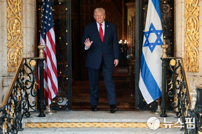 도널드 트럼프 미국 대통령이 2025년 12월 29일, 미국 플로리다주 팜비치에 위치한 자신의 마러라고 리조트에서 베냐민 네타냐후 이스라엘 총리를 맞이하며 몸짓을 취하고 있다. [사진=로이터 뉴스핌] |