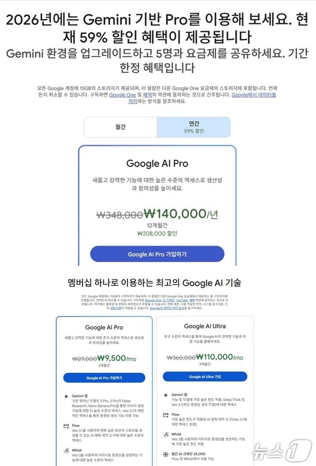 30일 IT 업계에 따르면 구글은 구글 원 공식홈페이지를 통해 34만 8000원 상당의 구글 AI 프로 멤버십 연간 구독권을 한국의 신규 구독자 대상으로 14만 원에 판매하고 있다. 할인율은 59.8%(20만 8000원)에 달한다.