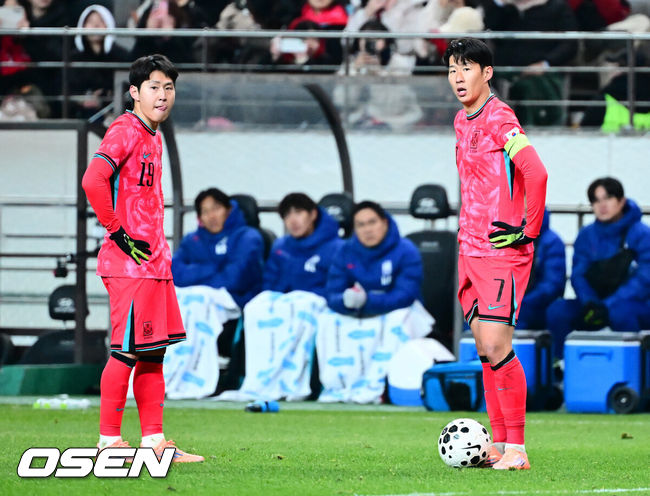 [OSEN=서울월드컵경기장, 지형준 기자] 홍명보 감독이 이끄는 한국 축구대표팀이 18일 오후 8시 서울월드컵경기장에서 열린11월 A매치 두 번째 친선경기에서'아프리카 강호' 가나를 상대로 1-0 승리했다.내달 2026 국제축구연맹(FIFA) 북중미 월드컵 조 추첨을 앞두고 열리는 마지막 평가전이었다.한국은 가나까지 잡아내면서 사상 최초로월드컵 포트 2를 확정하게 됐다. 이로써 대표팀은 홍명보 감독이 부임한 뒤 처음으로 A매치 2연전에서 나란히 승리를 거두게 됐다.후반 대한민국 이강인, 손흥민이 프리킥을 준비하고 있다. 2025.11.18 /jpnews@osen.co.kr |