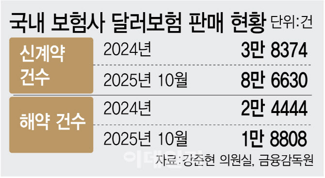 반면 올 1~10월 달러보험 해약 건수는 1만8808건으로 지난해 같은 기간(1만9361건)보다 오히려 줄었다. KB국민·신한·하나·우리은행 등 4대 은행이 올 들어 판매한 달러보험 판매액은 26일 기준 약 1조6590억원으로 집계됐다. 이는 지난해 연간 판매액 9710억원보다 70% 이상 늘어난 수치다.