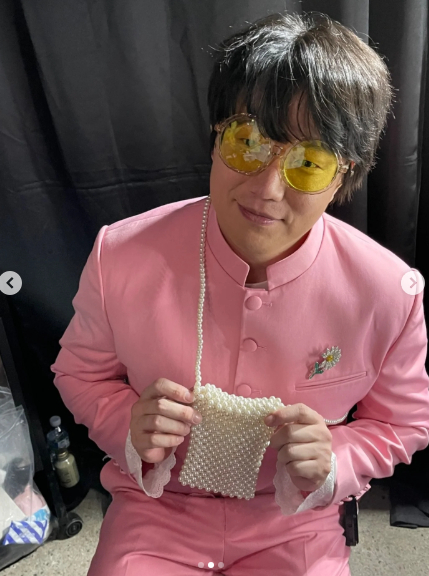 사진 속 성시경은 연말 콘서트 마지막 날 무대에서 지드래곤의 옷차림을 따라 한 모습이다. 노란색 선글라스, 진주 미니백, 데이지 브로치, 핑크 정장, 왕관까지 디테일을 모두 살렸다. 지드래곤의 곡 ‘Power’ 무대도 선보이며 관객들에게 큰 즐거움을 선사하기도 했다.