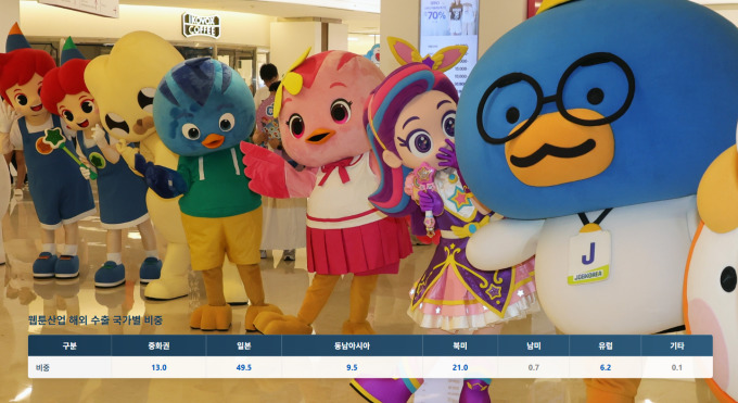 성장률은 주춤했지만, 해외 시장 확대는 여전히 견고하다. 2024년 웹툰 수출은 일본(49.5%)과 북미(21.0%)에 집중됐다. 특히 일본 수출 비중은 전년 대비 9.2%포인트나 급증하며, 웹툰 산업의 새로운 성장 축으로 자리 잡았다. 북미 시장도 1.3%포인트 증가하며 꾸준한 확장세를 보였다.