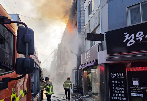 (광주=연합뉴스) 정다움 기자 = 30일 오전 9시 12분께 광주 동구 충장로 한 상가 3층에서 불이 나 소방 당국이 진화 작업을 하고 있다.