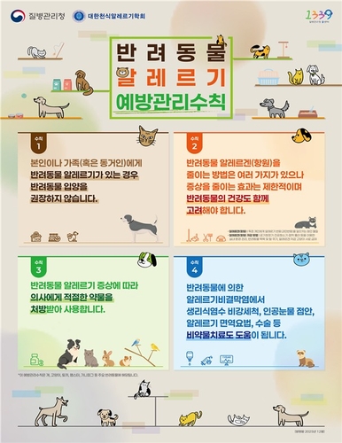 질병관리청과 대한천식알레르기학회는 반려동물 양육 가구의 지속적인 증가와 함께 알레르기 발생·악화 우려가 커진 데 따라 30일 이러한 내용의 '반려동물 알레르기 예방관리수칙'을 제정·발표했다.