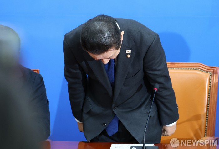 [서울=뉴스핌] 정일구 기자 = 김병기 더불어민주당 원내대표가 30일 오전 서울 여의도 국회에서 열린 원내대책회의에서 고개 숙여 사과하고 있다. 2025.12.30 mironj19@newspim.com