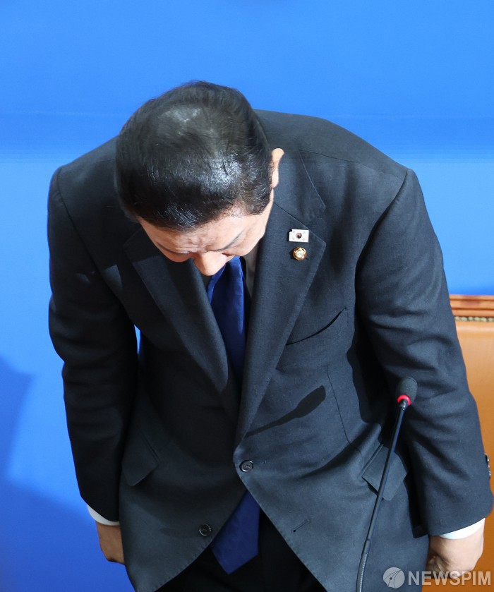 [서울=뉴스핌] 정일구 기자 = 원내대표직 사퇴 의사를 밝힌 김병기 더불어민주당 원내대표가 30일 오전 서울 여의도 국회에서 열린 원내대책회의에서 고개 숙여 사과하고 있다. 2025.12.30 mironj19@newspim.com