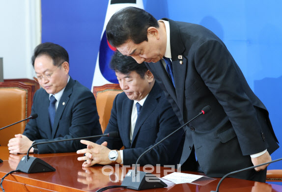 김병기 더불어민주당 원내대표가 30일 국회 원내대책회의에서 사퇴를 밝히며 고개 숙여 사과하고 있다.(사진=이데일리 노진환 기자) |