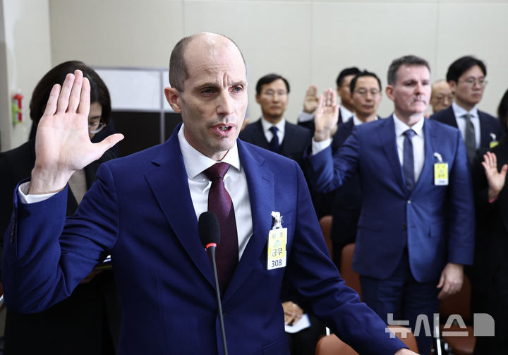 [서울=뉴시스] 김명년 기자 = 해롤드 로저스 쿠팡 대표이사가 30일 오전 서울 여의도 국회에서 열린 쿠팡 침해사고 및 개인정보 유출, 불공정 거래, 노동환경 실태 파악과 재발방지 대책 마련을 위한 연석 청문회에서 선서하고 있다. 2025.12.30. kmn@newsis.com |