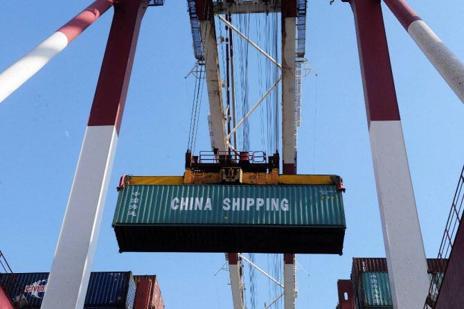 중국 동부 산둥성 칭다오항에서 크레인이 컨테이더를 나르고 있다. (사진=AFP) |