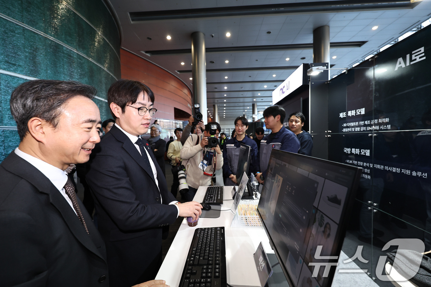 (서울=뉴스1) 구윤성 기자 = 하정우 대통령실 AI미래기획수석이 30일 오후 서울 강남구 코엑스 오디토리움에서 열린 '독자 AI파운데이션 프로젝트 발표회'를 앞두고 NC AI 부스에서 AI 체험을 하고 있다. 2025.12.30/뉴스1