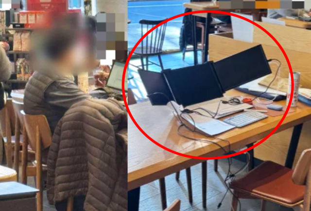 공개된 사진에는 한 중년 남성으로 보이는 손님이 노트북에 확장형 디스플레이 두 대로 총 3개의 모니터를 연결해 테이블을 가득 채우고, 주변 의자와 테이블에도 개인 짐을 올려놓은 모습이 담겼다.