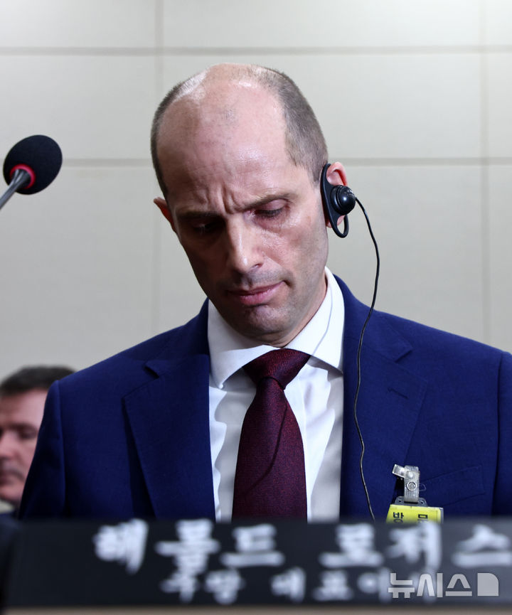 [서울=뉴시스] 김명년 기자 = 해롤드 로저스 쿠팡 대표이사가 30일 서울 여의도 국회에서 열린 쿠팡 침해사고 및 개인정보 유출, 불공정 거래, 노동환경 실태 파악과 재발방지 대책 마련을 위한 연석 청문회에서 동시통역기를 착용하고 있다. 2025.12.30. kmn@newsis.com |