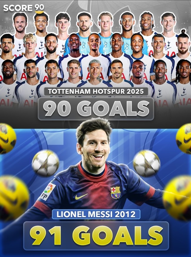 축구 매체 '스코어90'은 30일(한국시간) "2012년의 메시가 2025년 맨유와 토트넘 전체 스쿼드보다 많은 골을 기록했다"고 전했다.
