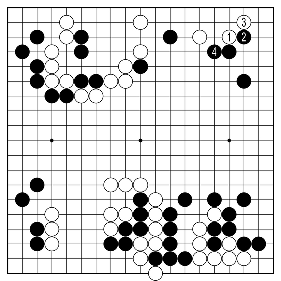 하변에서 대패한 리친청은 백1, 3으로 손을 돌린다. 여기서 신진서 9단은 흑4로 곱게 뻗었는데 이 수가 말하자면 두터운 수법이다. 귀의 AI 정석 중에서 가장 두터운 수법이라고 볼 수 있다.