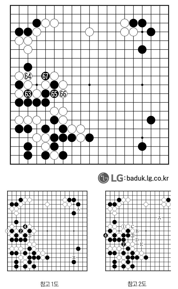 당연한 봉쇄로 보이는 66에 대해 AI는 승률을 크게 떨어뜨리면서 참고 2도 1을 추천했다. 4 이후 백 A로 모양을 키워 지금부터의 바둑이라는 것. 흑이 2 대신에 3으로 나오면 백은 2로 석 점을 살린다. 계속해서 흑 B부터 부호 순으로 백 E까지 이번에는 백이 실리로 대항해서 이 또한 지금부터의 바둑.